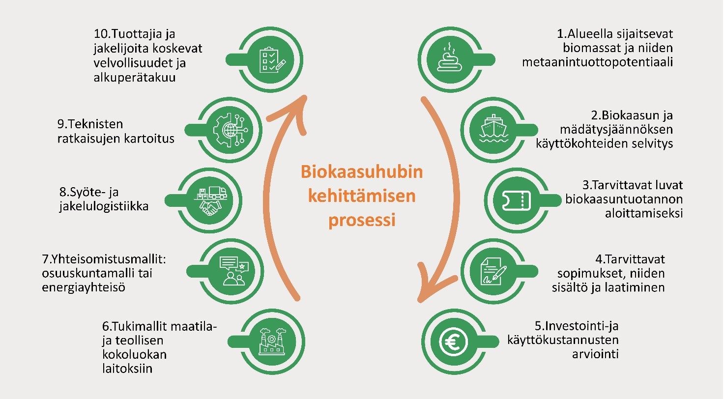 Toinen hankkeen keskeinen tulos on vaiheittainen prosessimalli, joka tukee alueellisten biokaasukeskittymien muodostumista ja kehittämistä. Malli perustuu hankkeessa tehtyyn työhön potentiaalisten biokaasuhubien tunnistamiseksi Pohjanmaan maakunnissa, ja se tarjoaa selkeän etenemispolun, jonka avulla alueelliset toimijat voivat suunnitella ja toteuttaa biokaasukeskittymiä tehokkaasti ja kestävästi. Biokaasuhubi on alueellinen kokonaisuus, jossa tuotanto, jakelu ja käyttö keskittyvät. Hankkeessa tarkastelluista keskittymistä Pohjanmaan hubi painottuu nesteytetyn biokaasun (LBG) tuotantoon ja meriliikenteeseen Vaasan seudulla, Keski-Pohjanmaan hubi teollisuuspuistoon Kokkolassa ja Etelä-Pohjanmaan hubi ruokajärjestelmään ja maatiloihin.